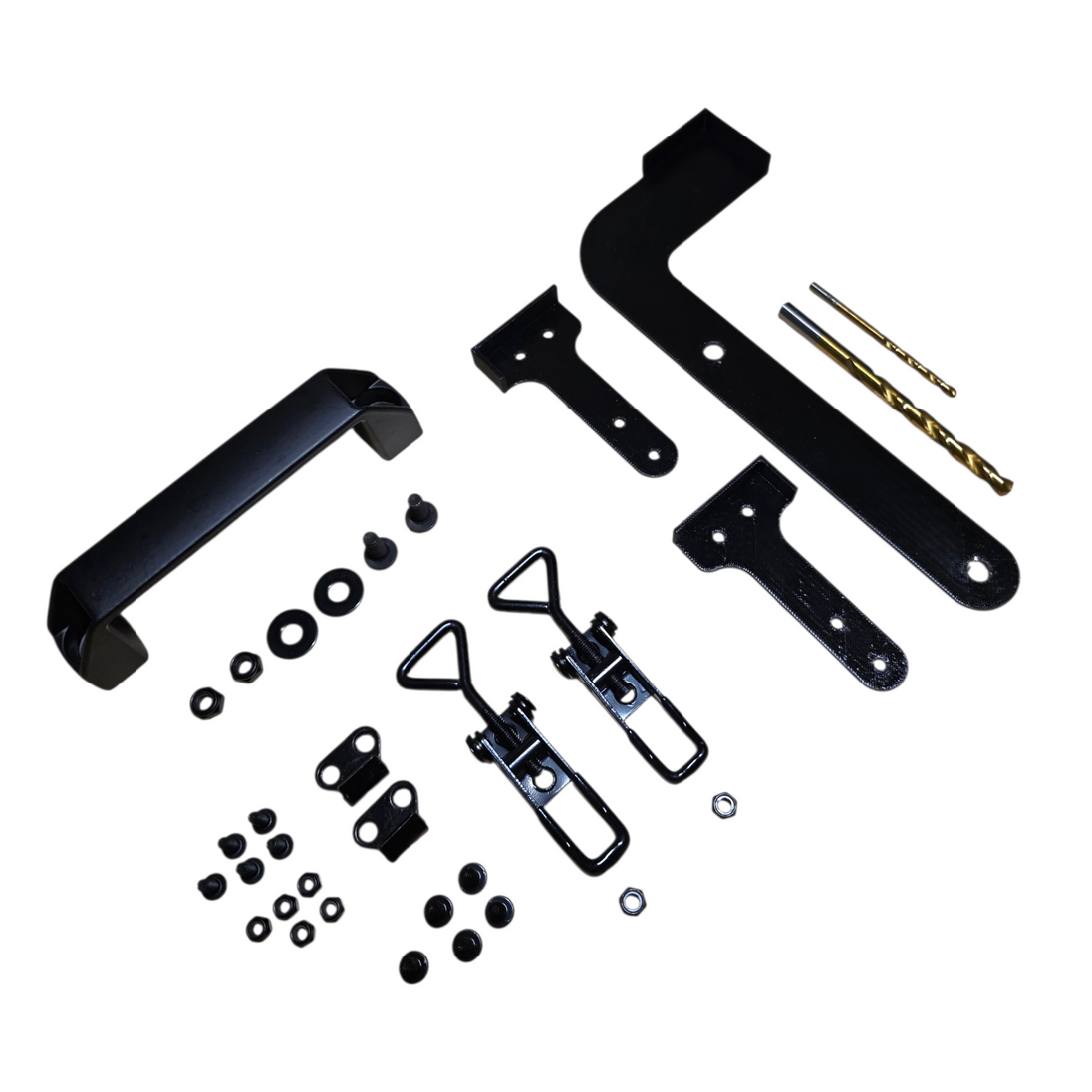 This kit contains all of the parts you need to add a carry handle and toggle latches to your Harbor Freight mini toolbox.